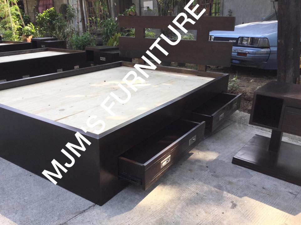 A minimalist platform bed with multiple pull-out drawers. Clean design with a spacious under-bed storage system.
