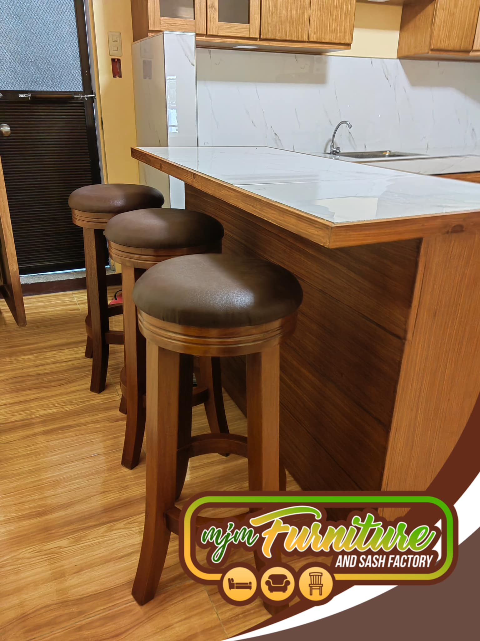 A tall, elegant stool with a rich leather cushion and a sturdy wooden frame. Its curved legs and circular footrest bring both comfort and durability, making it ideal for kitchen islands, bars, or modern cafés.