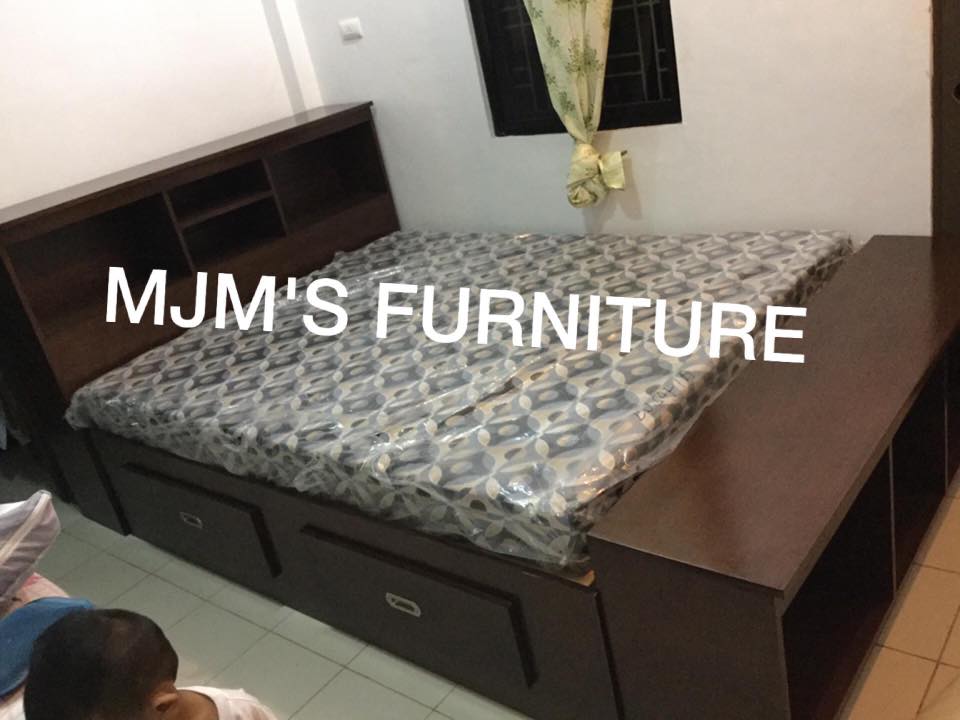 A minimalist platform bed with multiple pull-out drawers. Clean design with a spacious under-bed storage system.