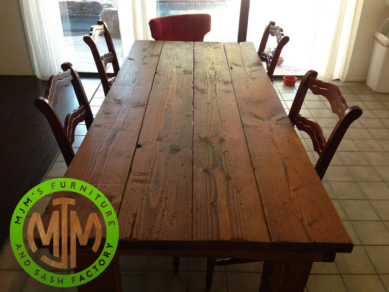 The "Rustic Farmhouse" Dining Table is a classic, oversized table featuring thick, distressed planks and sturdy trestle bases, perfect for large family gatherings and creating a warm, inviting atmosphere; it is constructed from Reclaimed Pine Wood for the tabletop and a Solid Pine trestle base.