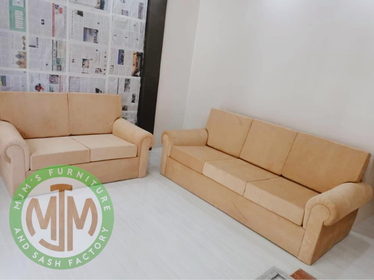 A cozy, three-seater sofa with soft cushioning and a warm, neutral palette. It brings a sense of comfort and relaxation, making it the centerpiece of any living room.
